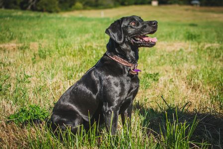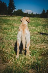 Duke has never met a stranger and is sure to be the silly goon of the bunch. He gets along well with every dog or person he meets. His favorite activity is to sit on top of his doghouse and boss the horses around. Duke loves water, puppies, birds, retrieving, kids and just about any activity is worth Duke being involved.